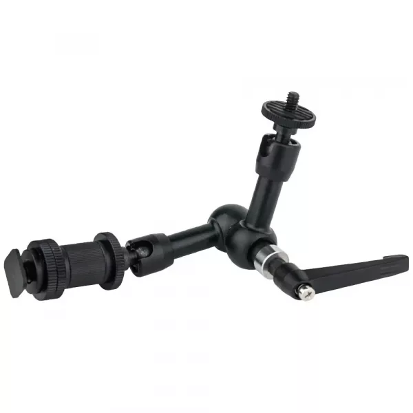 Кронштейн KUPO KCP-103 7″ MINI VISION ARM WITH HOT SHOE ADAPTER прецизионный шарнирный кронштейн предназначен для крепления впомогательного оборудования, например, внешних мониторов, беспроводного передатчика, приемника или других аксессуаров. Два резьбовых крепления 1/4″-20 на обоих концах могут вращаться на шаровых сочленениях на 360 градусов, а вырез во втулке вокруг шара позволяет наклонить крепление на 90 градусов. Центральное колено вращается на 360 градусов, обеспечивая множество положений установки. Кронштейн комплектуется адаптером «горячий башмак» и цилиндрическим переходником 3/8″-1/4″, позволяя соединить два аксессуара с разными монтажными креплениями.