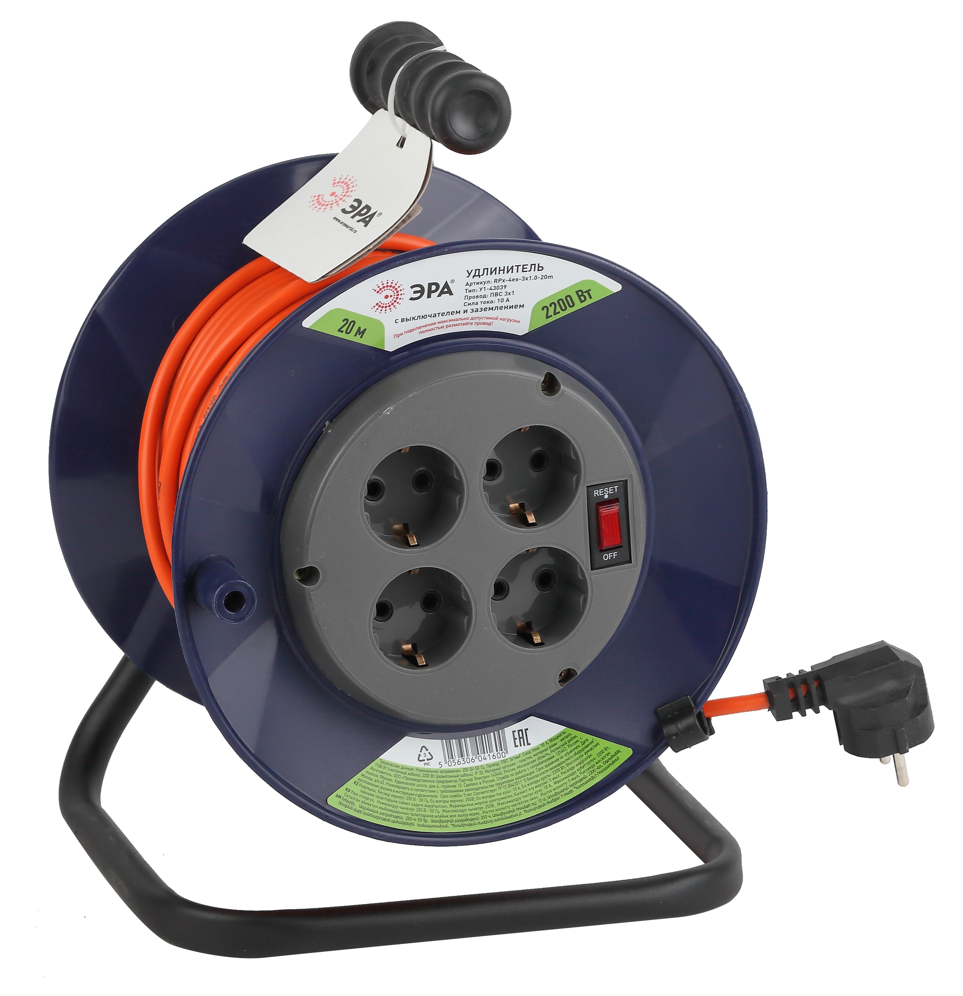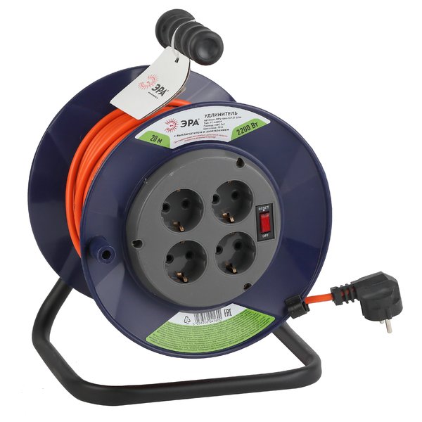 Удлинитель электрический на катушке ЭРА RPx-4es-3х1.0-20m имеет 4 розетки с заземлением и длину кабеля 20 метров.Установлена удобная ручка для переноски. Удлинитель можно применять для бытового и профессионального использования.