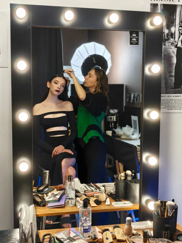— Гримерное место с большим зеркалом, длинным столом и настраиваемым качественным светом