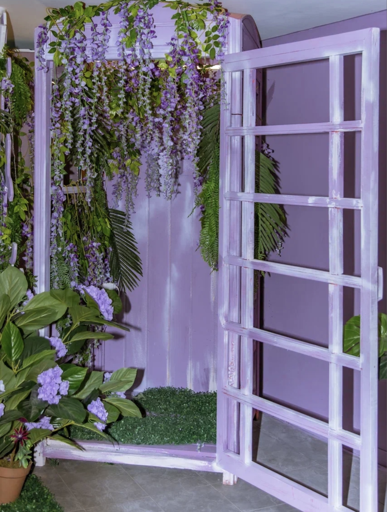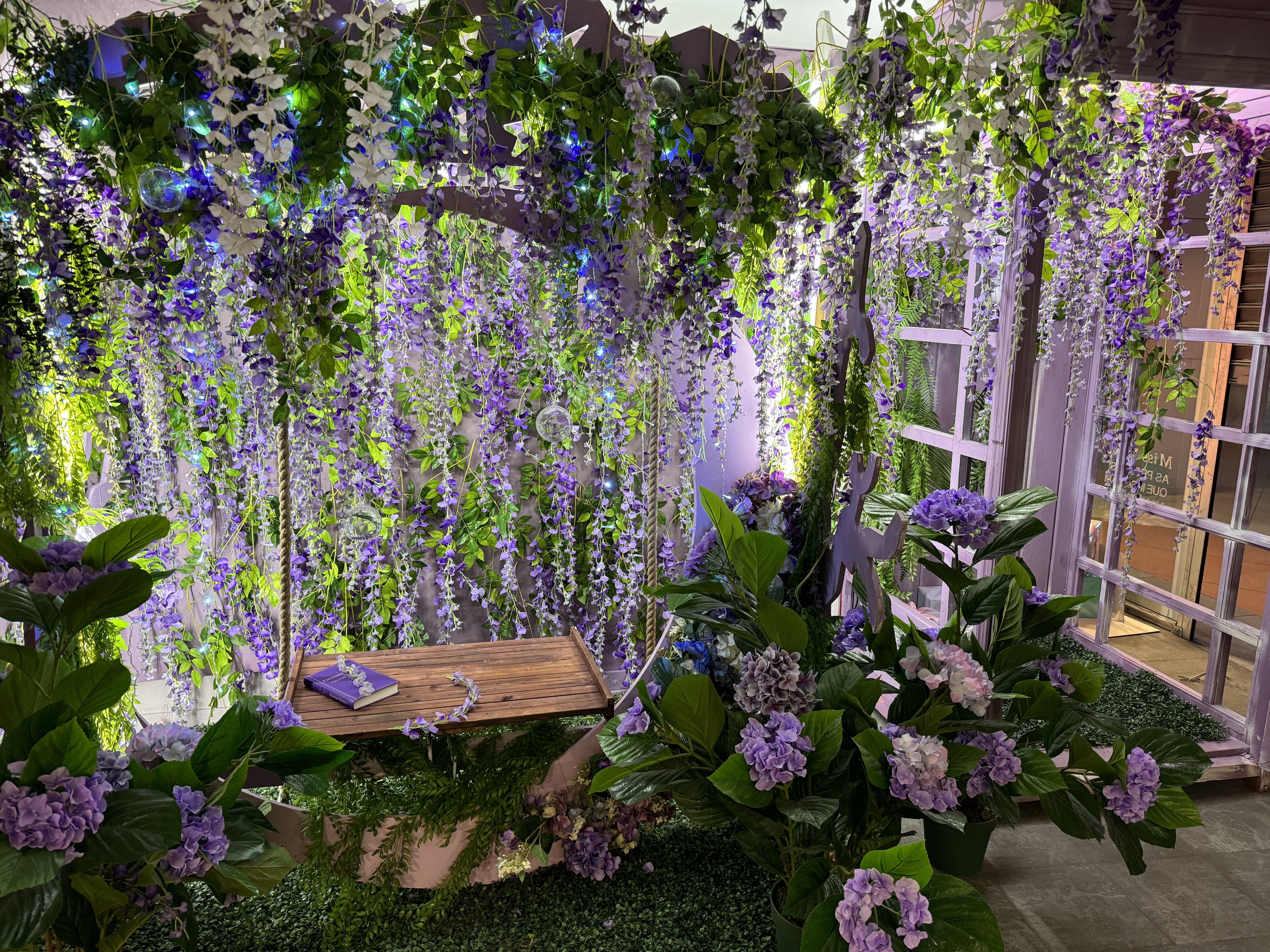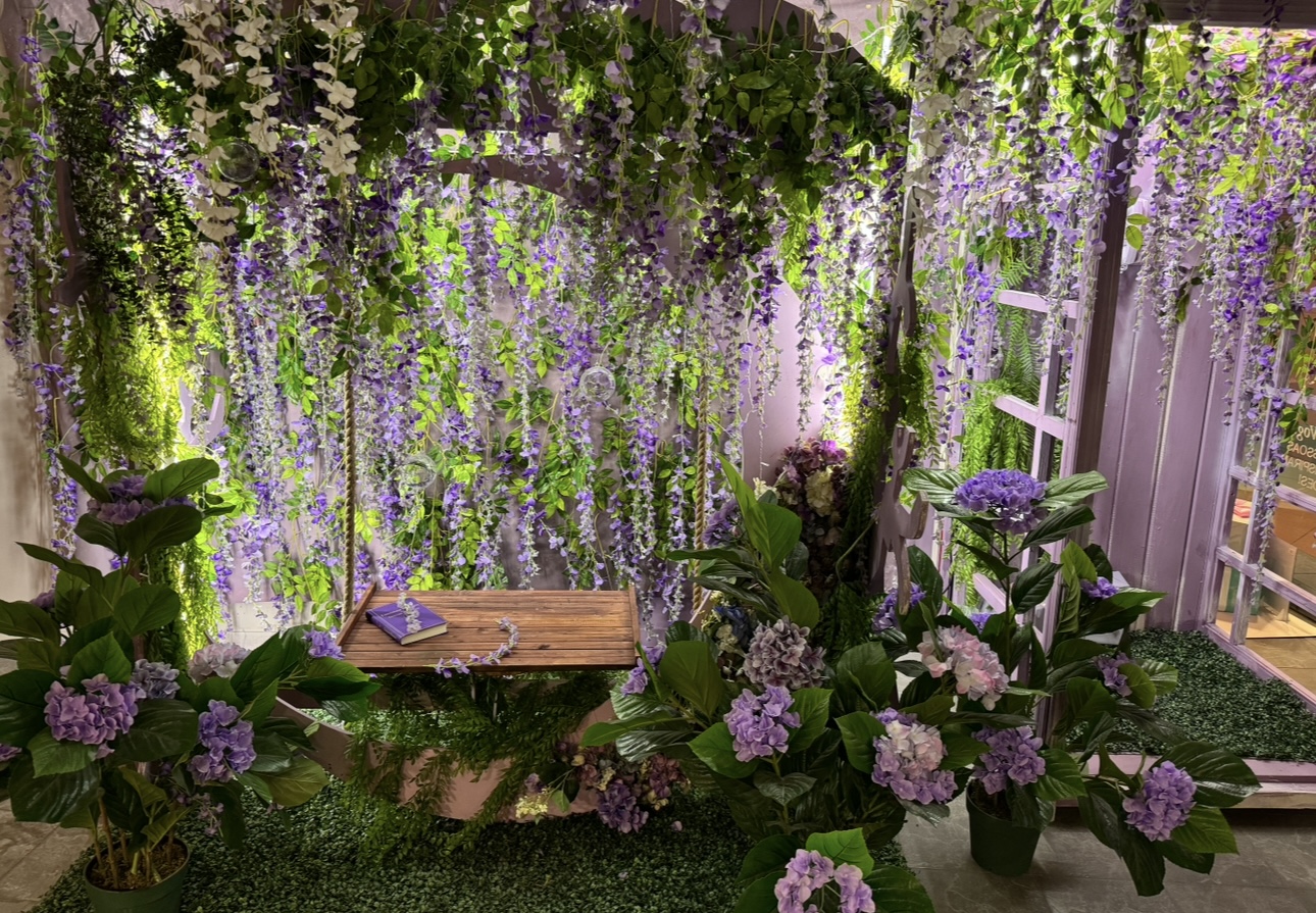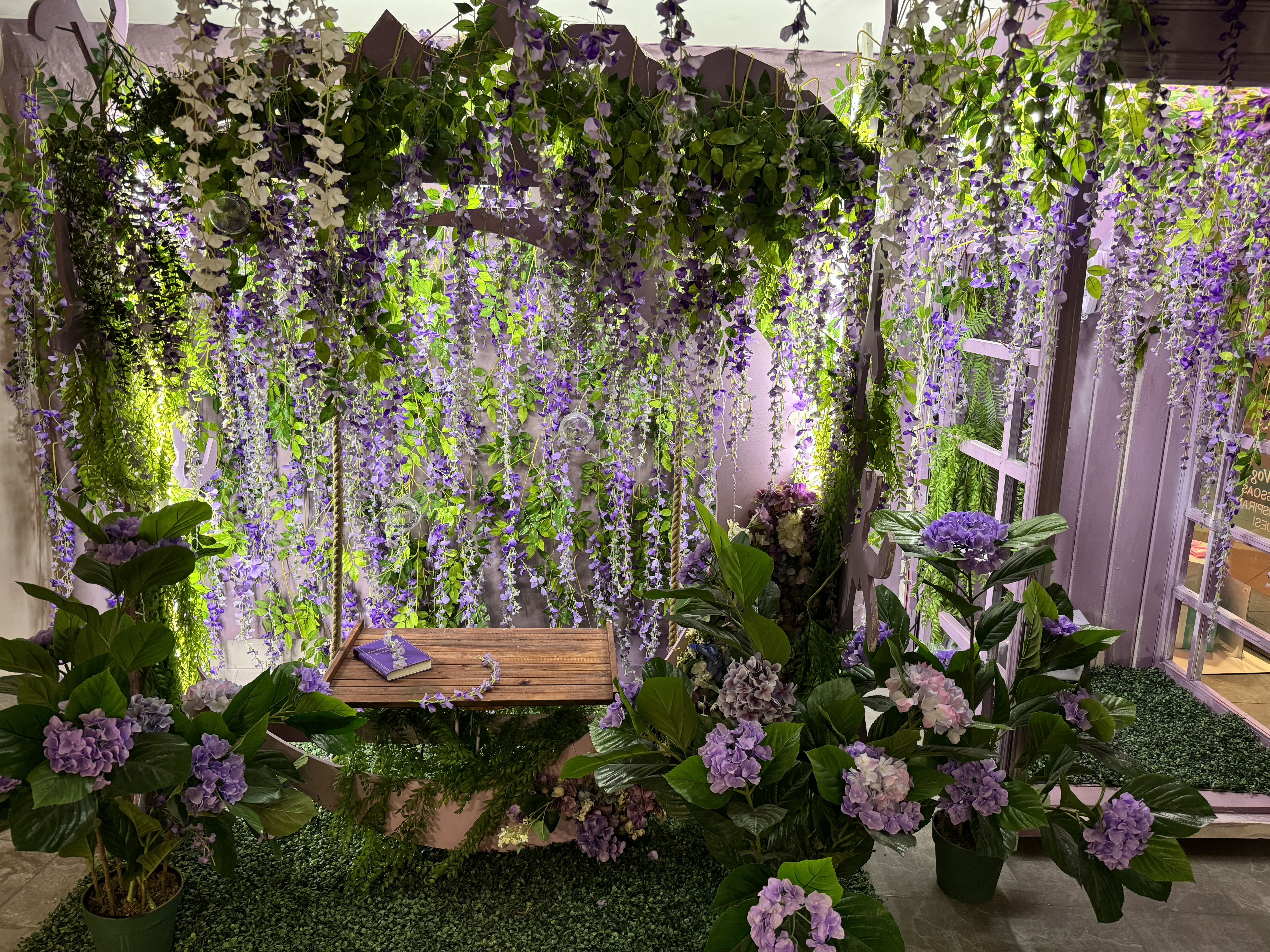 Качели с цветами и телефонная будка